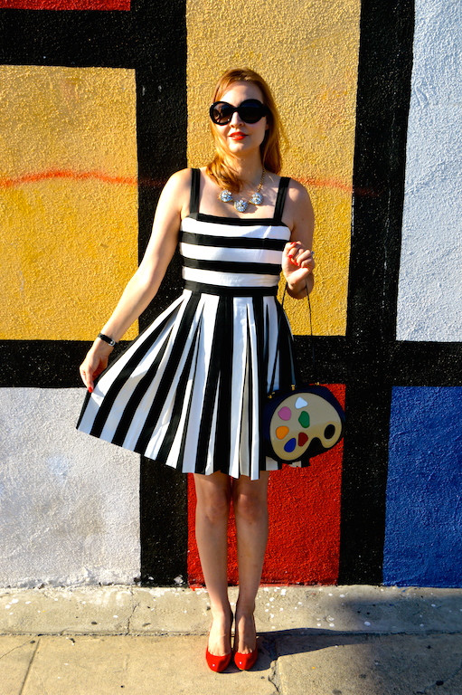 Since I knew in advance that I would be visiting the famous Mondrian wall, I planned ahead by taking out my vintage Moschino paint palette bag. I think this bag was made in the late 80s or possibly early 90s and the craftsmanship of it is fantastic, especially compared to many of the designer bags on the market today. The thing I love most about the bag is that it has its own paint brush, and I'm working the cheese factor in the last photo by pretending to paint with it. We took these photos right after closing time at the Artist and Craftsman Supply Store and I would have loved to see the expression of the employees coming out to see some crazy person pretending to be painting the side of the building, but I guess they've probably seen it all!